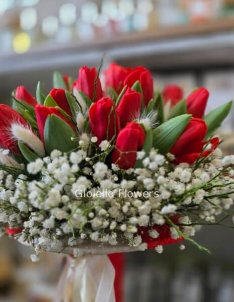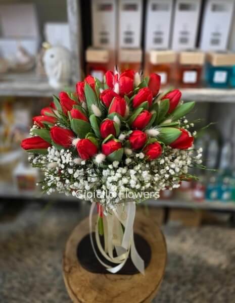 | Bouquet con struttuta di tulipani tonalità del rosso cod. 123124 | Importo € 70,00 | Num. steli : |