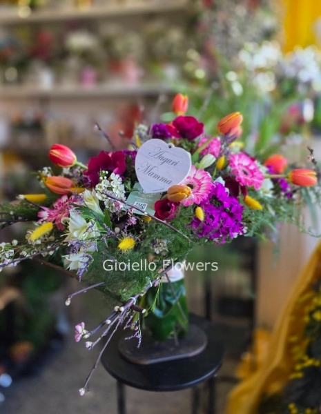 *Tipologia:* Bouquet con struttura artistica fatta a mano. * *Mood:* Elegante, Primaverile, Unico.