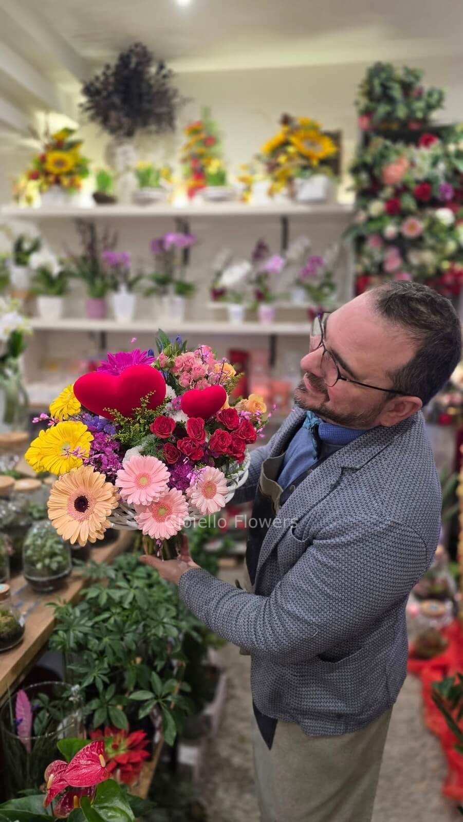 * Design Unico: Una struttura circolare artigianale che abbraccia fiori multicolori selezionati, con due cuori centrali simbolo di un legame indissolubile.