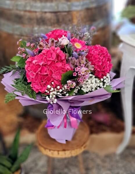 Bouquet con ortensie e fiori di stagione misto colorato