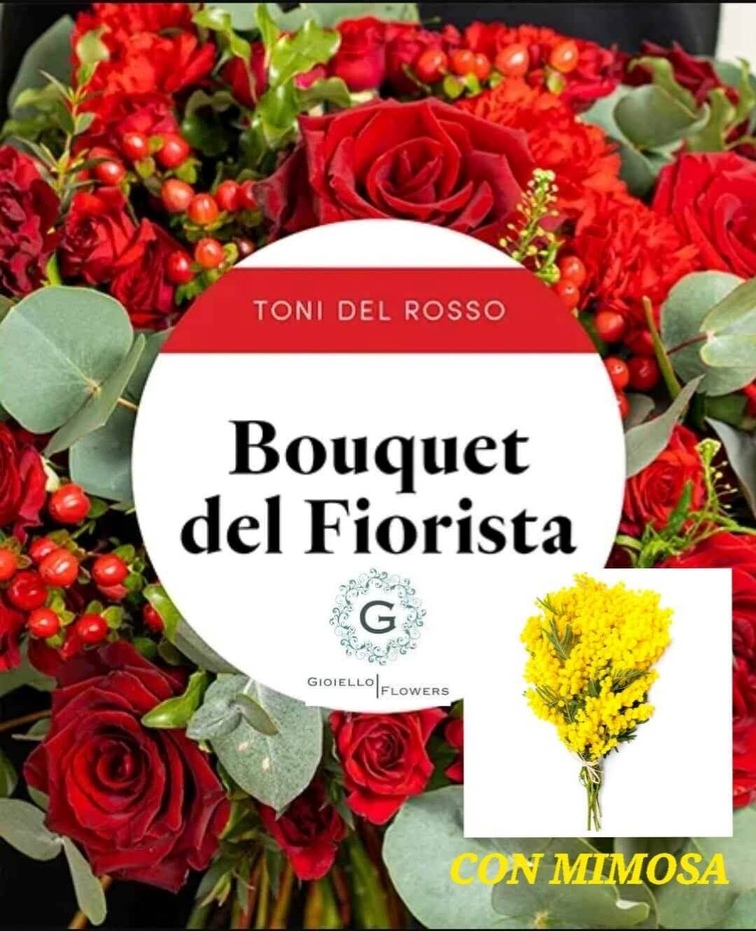 Bouquet del fiorista con mimosa sui toni del rosso
