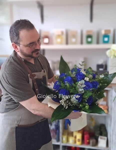 | Bouquet di rose blu con verde e fiori complementari cod. 103279 | Importo € 27,00 | Num. steli : |