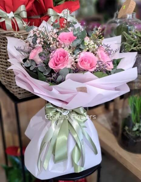 | Bouquet di rose rosa con verde e fiori complementari cod. 103272 | Importo € 25,00 | Num. steli : |