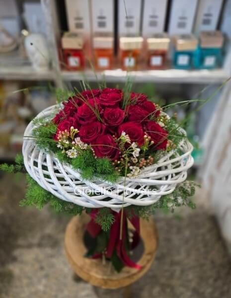 Scegli il bouquet di rose rosse "Cerchio d'amore" e lascia che i tuoi sentimenti parlino attraverso i fiori.