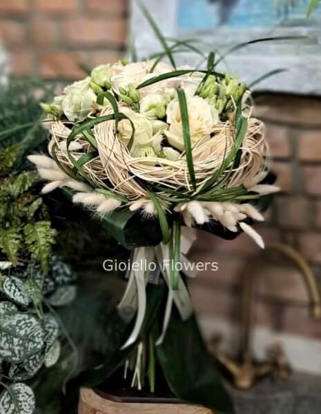 Un omaggio unico e particolare con struttura naturale e finiture di pregio, dalle linee sinuose ed eleganti, nato dall'ispirazione e la professionalità del Floral Designer Francesco Gioiello, realizzato con rose, lisiantus, verde decorativo ed elementi complementari. Personalizzabile nelle tonalità desiderate da concordare tramite contatto telefonico.