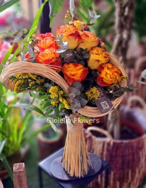 Un omaggio unico e particolare con struttura naturale e finiture di pregio, dalle linee decise e con colori accattivanti, nato dall'ispirazione e la professionalità del Floral Designer Francesco Gioiello, realizzato con rose, verde decorativo ed elementi complementari. Personalizzabile nelle tonalità desiderate da concordare tramite contatto telefonico.
