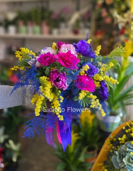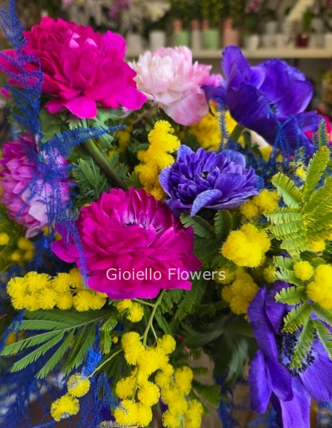 In questa creazione esclusiva, la profondità cromatica dell'Anemone incontra la luce vibrante della Mimosa, creando un contrasto moderno e raffinato che profuma di primavera e stile italiano. ![]()