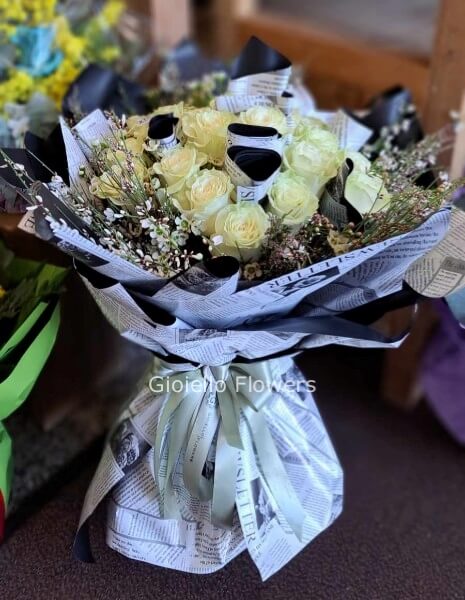 Bouquet con rose bianche e inserti decorativi sulle tonalità del nero.