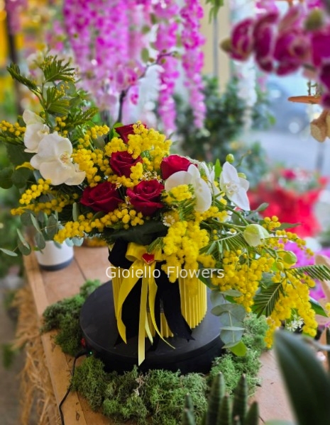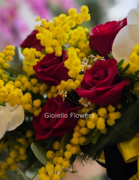 * Contrasto Iconico: L'energia della mimosa incontra l'eleganza intramontabile della rosa rossa.