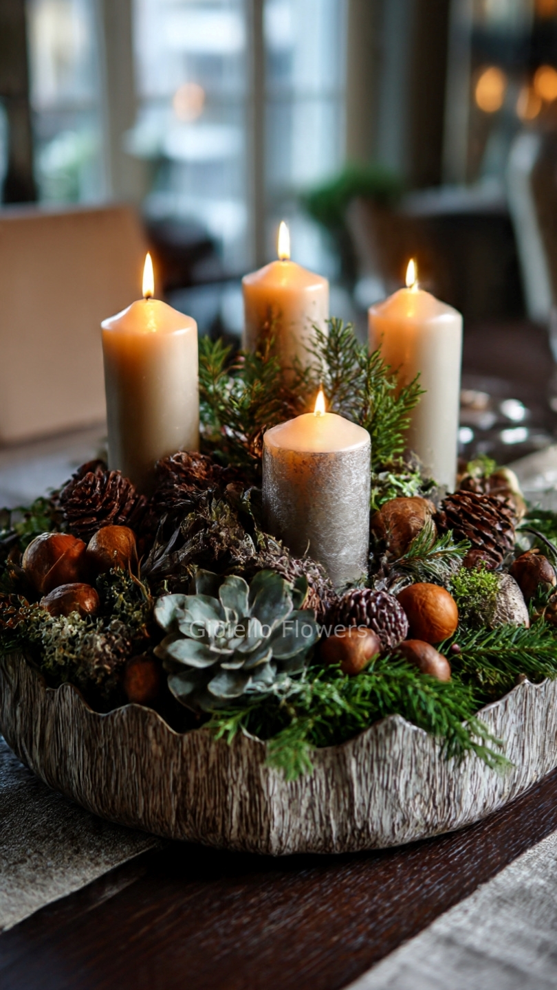 Ogni centrotavola è realizzato con candele e pino in stile minimal senza decori vistosi, selezionati con cura per garantire un prodotto realmente artigianale.