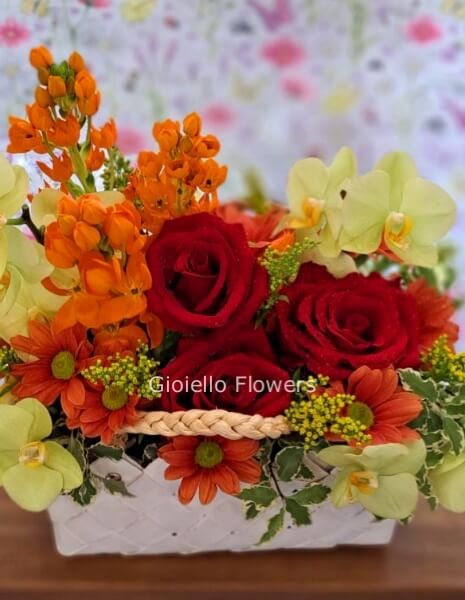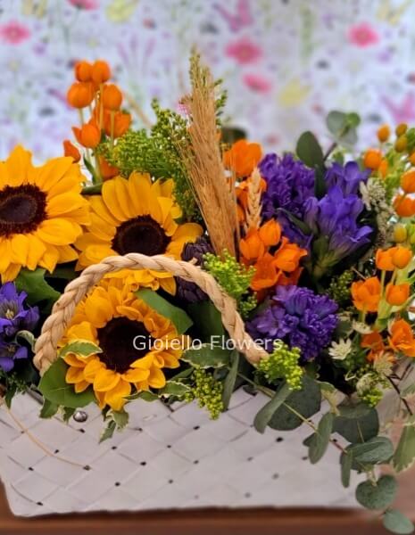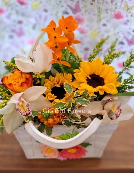 Composizione di fiori di stagione in cesto "HAPPY"