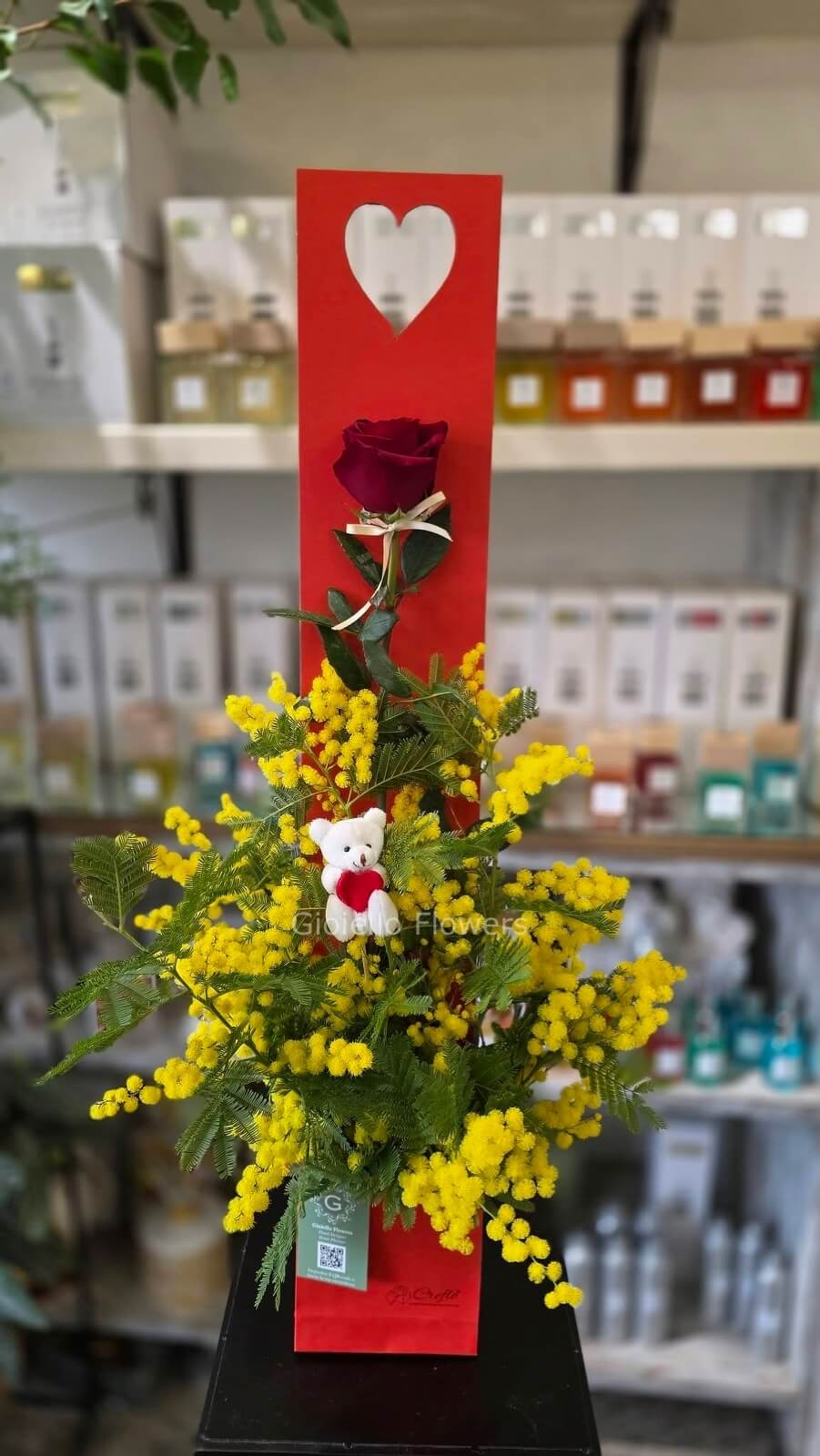 Love e Donna : Rosa rossa e mimosa in scatola