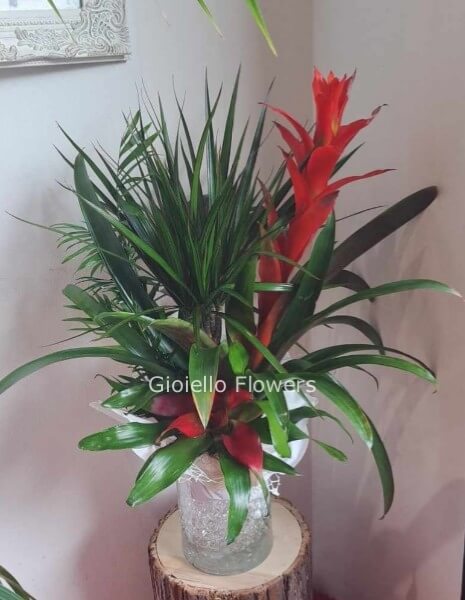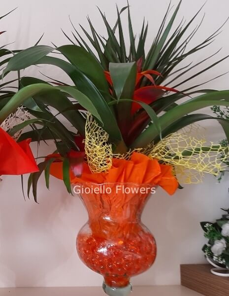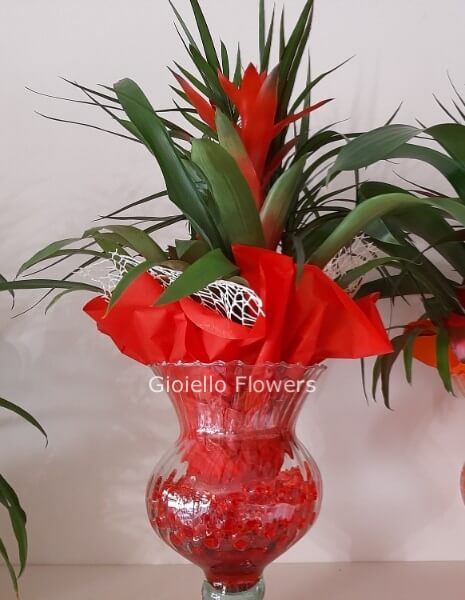 la Guzmania che è una pianta tropicale appartenente alla famiglia delle Bromeliacee e, proprio come molte altre specie di questa famiglia, è caratterizzata da lucide foglie a rosetta alla cui base si forma un pozzetto per l’acqua che in natura funge da recipiente per il suo nutrimento. Hanno foglie morbide di colore verde brillante lucente, la coppa centrale composta da brattee scarlatte o arancio vivo, porta piccoli fiori tubulosi gialli o bianchi.